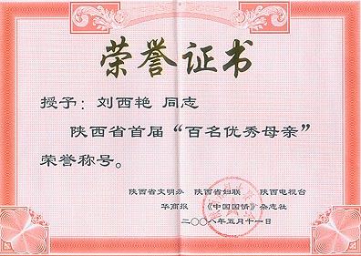 5月15日,省妇联下发陕妇发[2008]46号文件,授予“坊上人”总经理刘西艳等100位同志陕西省首届“百名优秀母亲”荣誉称号,并颁发了荣誉证书。文件号召受表彰的同志们能珍视荣誉,发扬成绩,再接再厉,与时俱进,不断创造新的成绩。希望全省广大妇女学习她们胸怀祖国、以德育人、为国教子的思想境界;学习她们热心公益、孝老爱亲、甘于奉献的精神风范;学习她们爱岗敬业、顽强拼搏、追求卓越的优秀品质,在和谐家庭、和谐社会建设中发挥更大作用,为我省实现西部强省奋斗目标作出新的更大的贡献。