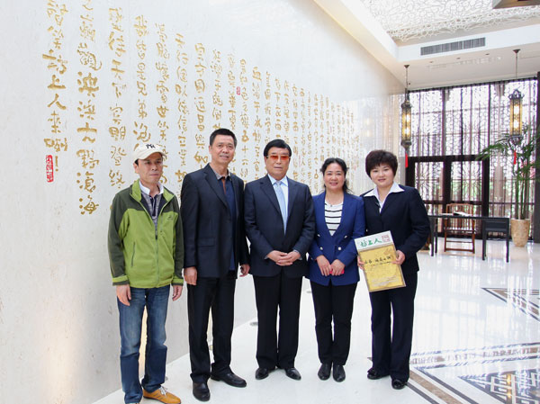 马国超将军(中)等领导与“坊上人”盛志明董事长、刘西艳总经理合影留念