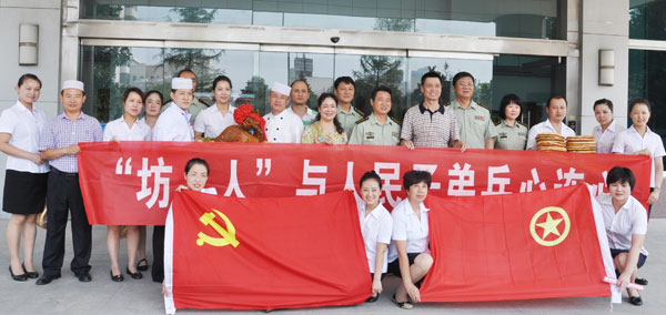 “军民鱼水情谊深,民族团结一家亲”,2013年“八一”建军节到来之际,西安坊上人清真餐饮有限公司盛志明董事长、刘西艳总经理带领企业党、团员代表和部分高管,于7月31日分别前往陕西省警卫局和西安市消防支队高新区大队工业园中队营地,看望慰问了酷暑中坚守岗位的武警官兵,送去凝聚着“坊上人”浓浓民族情谊的《慰问信》及烤全羊、芝麻香馕和西瓜等慰问品,把最美好的祝福带给每一位子弟兵,受到官兵们的热烈欢迎和诚挚感谢。