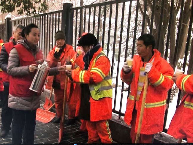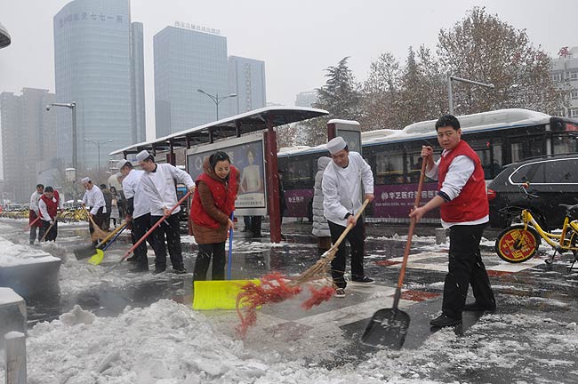西安坊上人清真餐饮有限公司不仅连日组织员工清扫所属各店门前的积雪,并且积极奉献爱心,利用工余时间组织员工冒着寒风和大雪,来到周围的广场、街道、公交车站、人行道、过街天桥、居民社区等人流量大的区域,与市政环卫人员并肩战斗,铲冰除雪,开辟出一条条安全通道,保障了行人的安全出行。与此同时,公司还连日熬煮姜汁可乐送到冰雪寒风中辛勤除冰扫雪的环卫工人手中,并特别邀请附近的高新区保洁员进店做客,送上一碗碗热气腾腾的羊肉泡馍,让他们在寒冷的冰雪冬日感受到“坊上人”的温暖爱心。