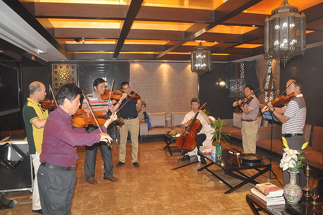 老兵们如今都是乐坛大腕,但真挚的战友之情仍纯洁质朴,感人至深。他们个个身怀绝技,纷纷拿出大提琴、小提琴、葫芦丝、埙等各式乐器展示自己的演奏绝活,并合奏、合唱了《绒花》、《我爱你中国》、《我的中国心》、《一条大河》、《我和我的祖国》、《母亲》、《山楂树》、《沂蒙颂》、《鸿雁》、《同一首歌》、《难忘今宵》、《莫斯科郊外的晚上》、《乘着歌声的翅膀》等许多脍炙人口的经典老歌和名曲,优美动听的乐曲此起彼伏,萦绕餐厅,俨然成了一场难得的现场版经典演奏会,令人陶醉。很多就餐顾客被引来围观拍照,不时给予热烈掌声,“坊上人”员工也被感染,与客人们联欢互动,共同演唱经典歌曲,餐厅里歌声嘹亮,欢声笑语,变成了欢乐的海洋。